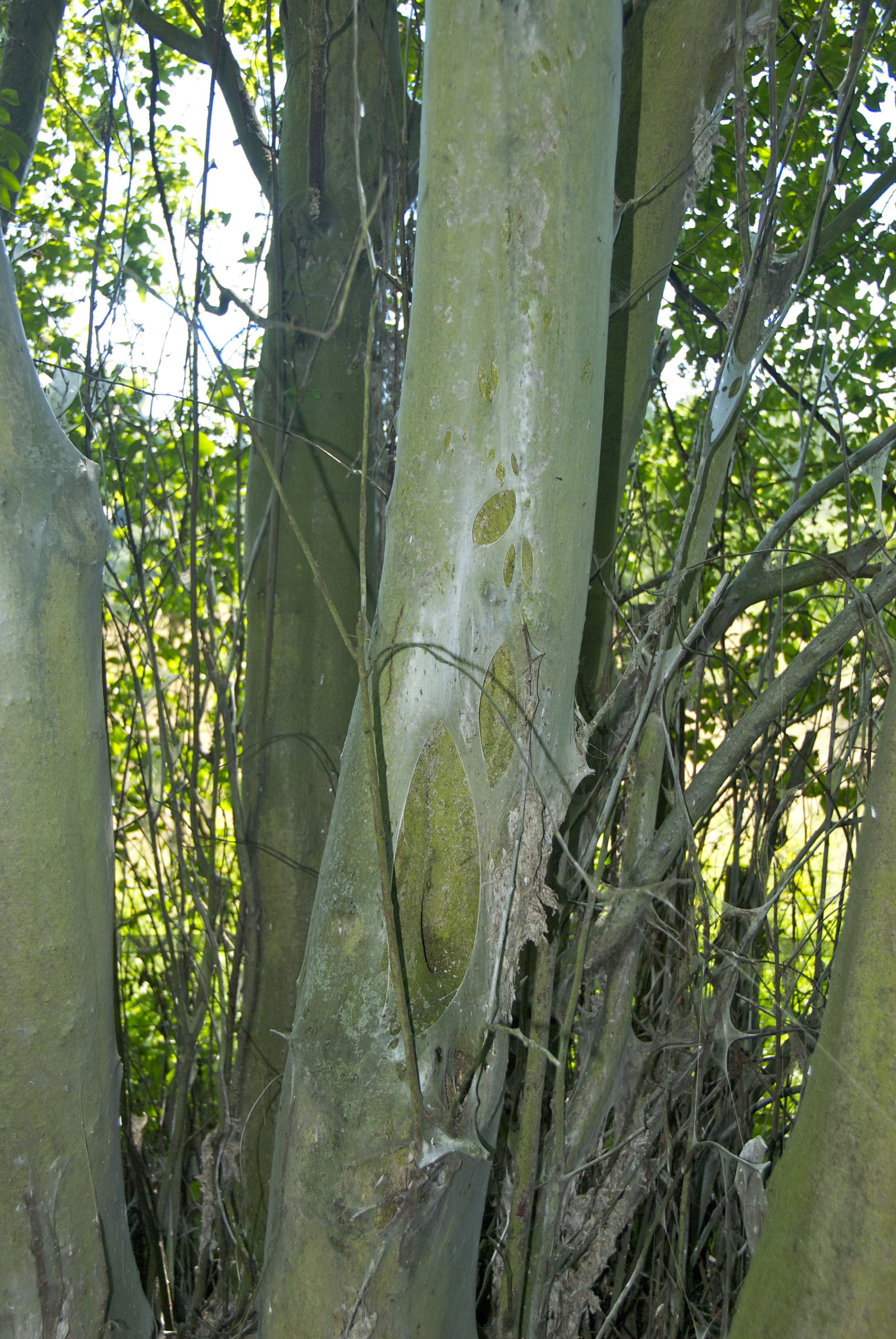 Die Weiden an der Kollau sind in schimmernde Seide gehüllt. Die Raupen des Schwarmspinners haben sie von oben bis unten eingesponnen. Sie entwickeln sich unter der Seidenhülle und fressen am Baum. Aber sie schaden dem Baum nicht. Ab Juli verpuppen sich die Raupen. Dann kann er sich erholen.