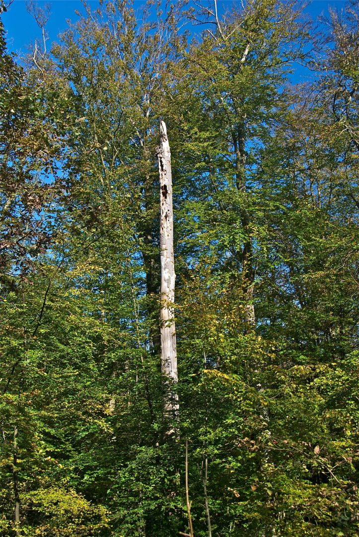 Nee, nicht wegräumen! Denn in den toten Bäumen leben Insekten, von denen leben vier Spechtarten: Grünspecht, Schwarzspecht, Buntspecht und Kleinspecht. Sie bauen auch ihre Bruthöhlen in die abgestorbenen Stämme. Und wenn sie ausziehen, dann ziehen ihre Nachmieter ein. Alle Höhlenbrüter, vom Waldkauz bis zum Kleiber profitieren davon. Würde man hier aufräumen, gäbe es jede Menge Obdachlose.