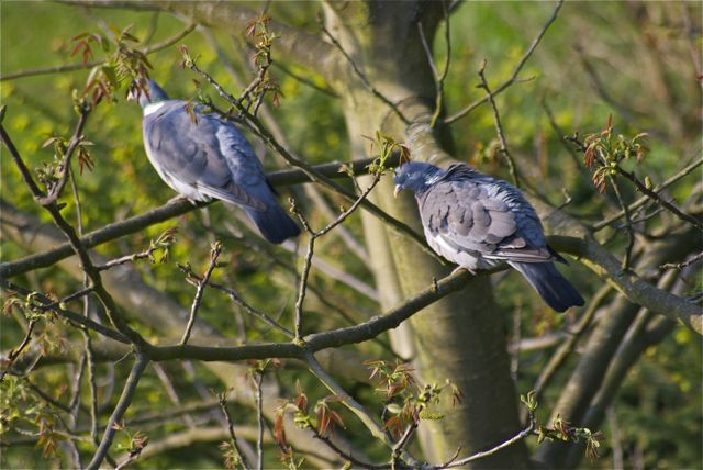 Dies freut auch meine Nachbarn: Herr und Frau Ringeltaube leben hier schon länger. Sie sind nicht zu verwechseln mit der allgemeinen Stadttaube, auch „Ratte der Lüfte“genannt. Stadttauben sind die Nachkommen von Brieftauben, die es nicht nach Hause geschafft haben. Ringeltauben sind echte Wildtiere. Sie mögen Samen und Früchte und nisten auf Bäumen. Sie sind viel größer als Stadttauben und gut zu erkennen an dem weißen Halsfleck.
