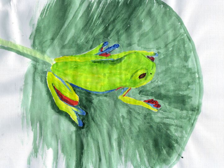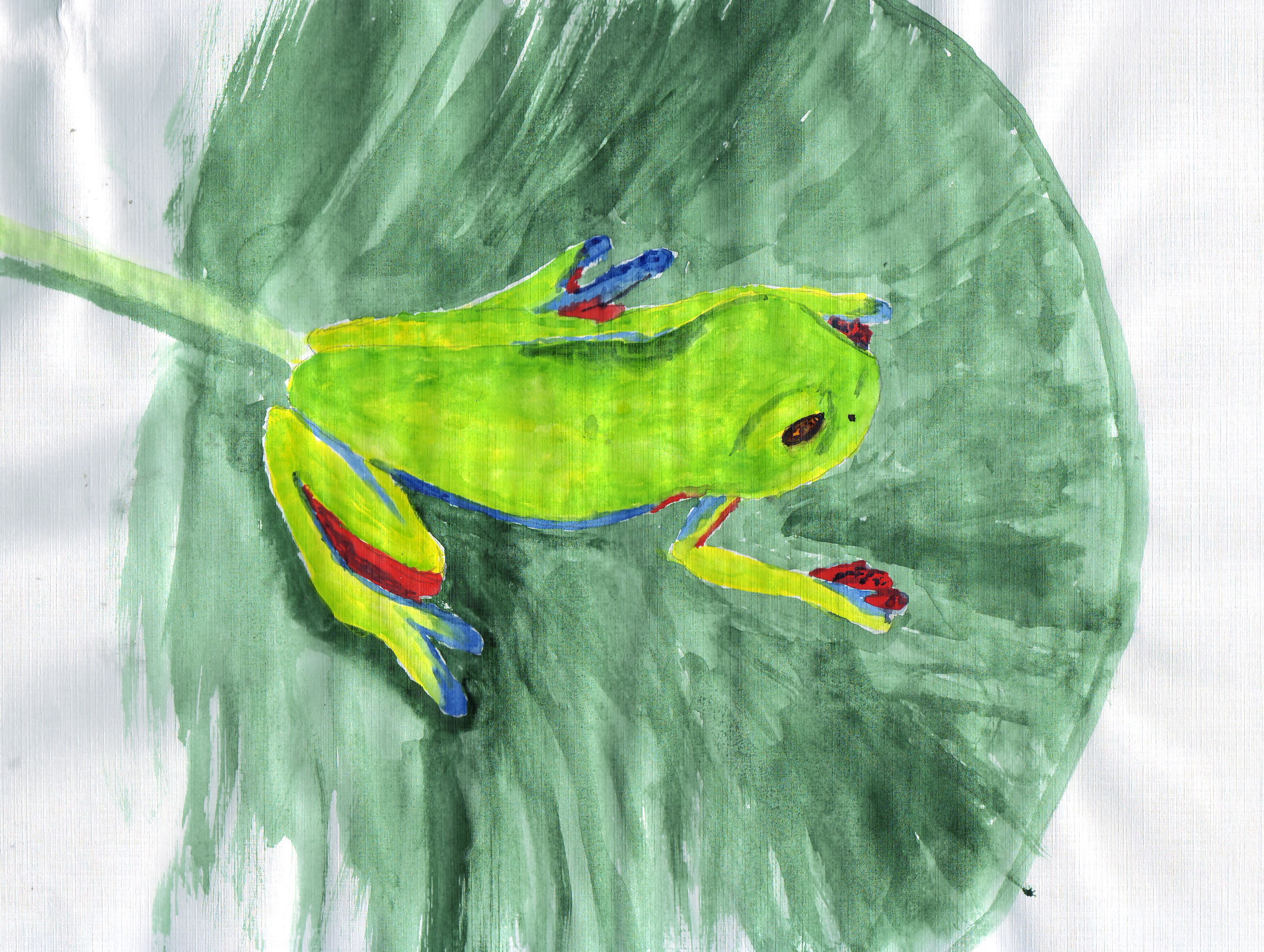 Die zweite Erkenntnis: Die beiden Pinsel, die ich neulich gekauft habe, sind zum wegschmeißen gut. Deshalb sieht das Blatt des Froschs so schmierig aus. Die würde ich nicht mal einem Kind in den Tuschkasten legen. Ich habe nur noch einen vernünftigen Marderpinsel von Anno dunnemals.