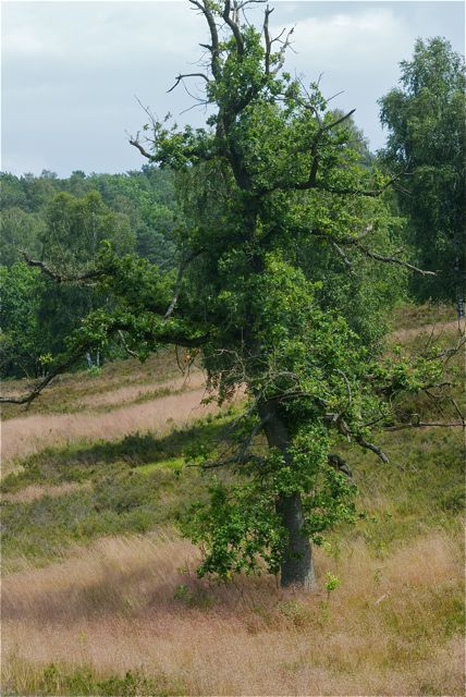 Hier sieht man schön die Heideflächen im Vordergrund, einige Birken und Eichen im Hintergrund. Der Boden ist also per se schon sandig, und eher Nährstoffarm. Daran, dass sich Heide entwickeln konnte, ist aber der Mensch schuld. Denn durch ständiges Abholzen und Abplaggen wurden dem Boden immer mehr Nährstoffe entzogen, so dass nur ganz anspruchslose Pflanzen hier ein Auskommen hatten.
