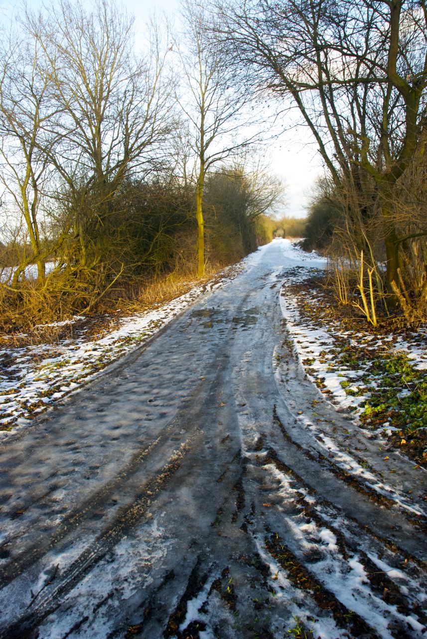 Das wäre hier nicht passiert. Hier geht es direkt zum Königsforst (Brücker Hardt) , zur Erker Mühle und zum Wildgehege Brück. Heiß-Kalt-Weg habe ich den als Kind genannt, weil aufgrund irgendeiner thermischen Laune der Natur, die Temperatur alle paar Meter anders ist, also 5m warm, 5m kalt, 5m warm, 5m kalt… Momentan ist es aber 100% Eisbahn.