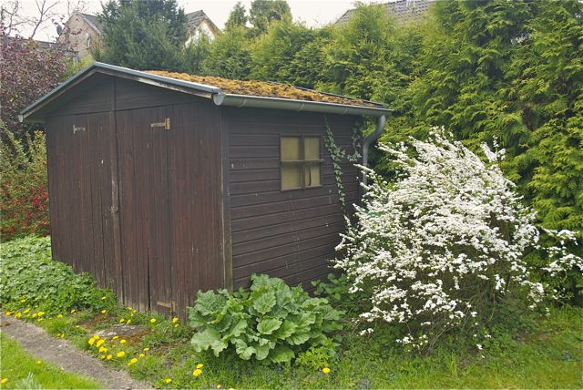 Der Rhabarber ist nicht tot zu kriegen, selbst wenn man einen Schuppen drauf stellt.