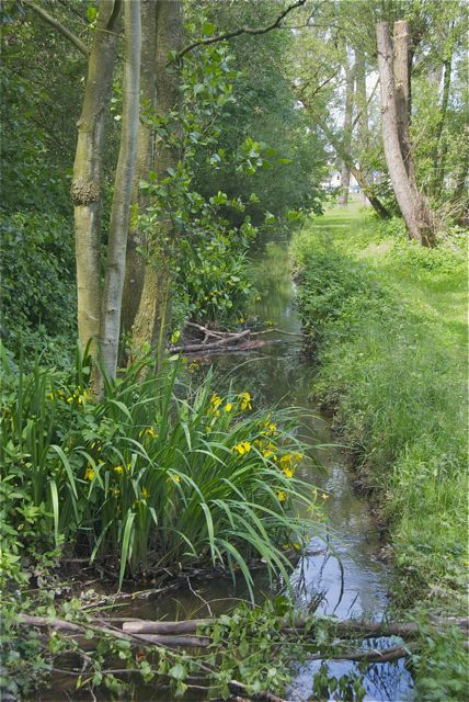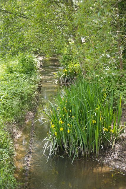 Der ist hier leider noch etwas begradigt, aber am Ufer blühen die Schwertlilien.