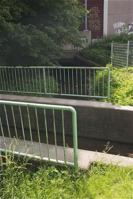 Hier verläuft der Flehbach als historischer Stadtbach, tiefer gelegt. Leider ist die Absperrung nicht mehr kindersicher und der Bach ist auf ganzer Länge mit einem Bauzaun abgesperrt.