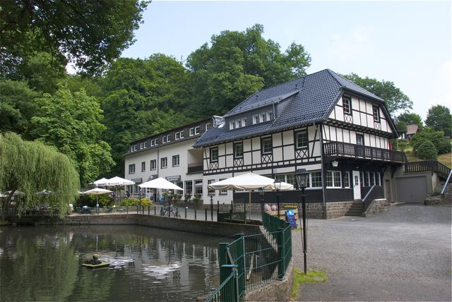 Ja, sie ist noch da. Auch das Mühlrad dreht sich noch und am düsteren Mühlteich kann man immer noch sitzen und essen.