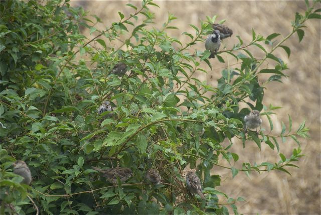 Schon Anfang August ist es hier ziemlich herbstlich. Die Spatzenbande vergnügt sich auf den abgeernteten Feldern. Alle anderen haben schlagartig aufgehört zu singen. Auch Strippe flötet mir nichts mehr vor. Zunächst dachte ich, er sei umgekommen, aber gestern sah ich ihn ganz munter durchs Unterholz flitzen.