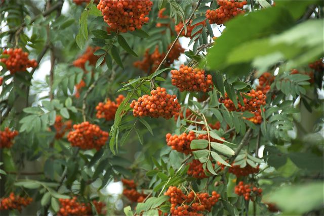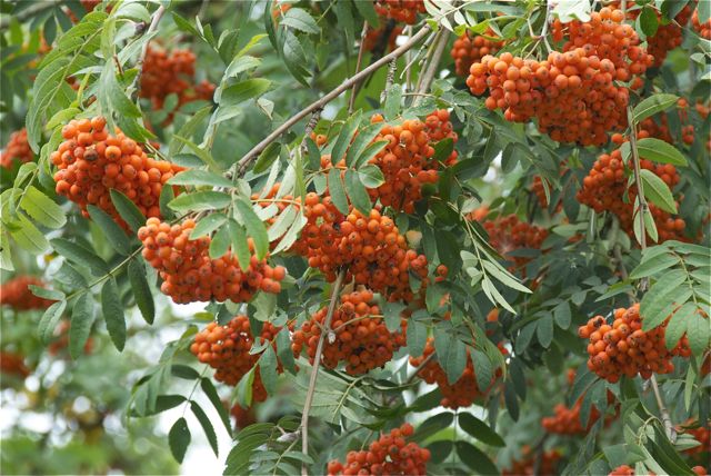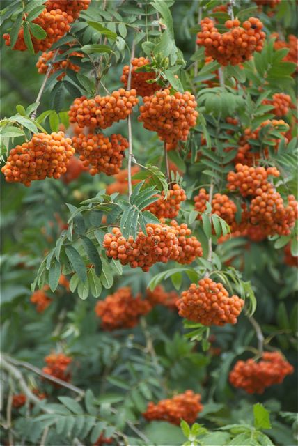 Zum Beispiel leckere Vogelbeeren. Als ich klein war, wurde mir noch eingebläut, die seien giftig. Stimmt nicht ganz. Angeblich kann man Marmelade und Chutneys daraus herstellen. Ich habe es nicht ausprobiert.