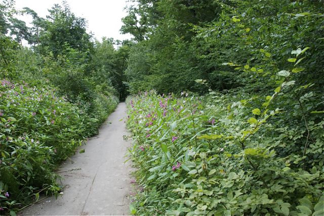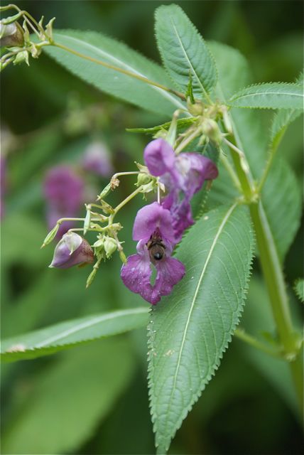 Neophyten. In diesem Fall indisches Springkraut, massenhaft. Es wurde als Zierpflanze eingeführt und verbreitet sich ungehemmt. Einerseits, weil die Samen bis zu 7 m weit geschleudert werden, andererseits, weil sie gut schwimmen. Daher werden vor Allem Uferstreifen von den Pflanzen besetzt. Einheimische Pflanzen werden verdrängt.