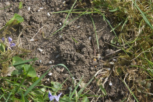 Wo der Maulwurf gebuddelt hat, wächst kein Gras mehr. Voriges Jahr habe ich da ein paar Blumensamen drauf geworfen, die dann erblüht sind. Weil das geklappt hat, mache ich das wieder so. Renne also mit der Streudose durch den Garten, streue und trete die Samen fest. Doch was ist das?