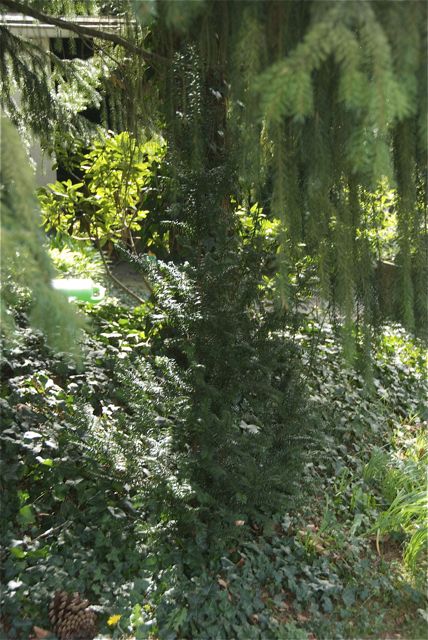Unter drei Fichten hat sich eine kleine Eibe angesiedelt. Merkwürdige Standortwahl.