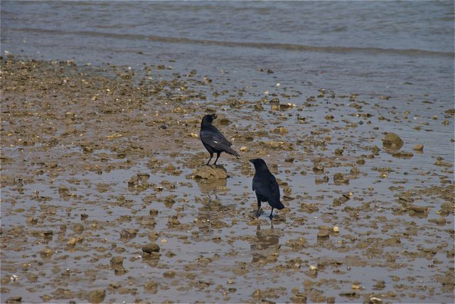 Auf Holnis konnte ich schon Krähen beobachten, die Muscheln knackten, indem sie sie aus großer Höhe auf den harten Deich fallen ließen. Und auch am Rhein haben die Rabenkrähen eine leckere Muschelmahlzeit zu schätzen gelernt.