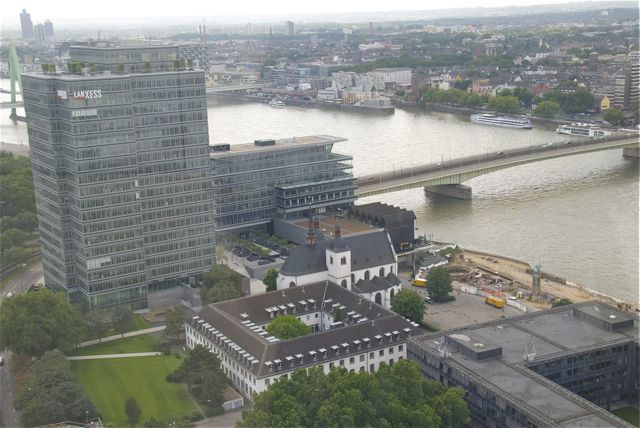 Das Lanxess Gebäude aus den 70ern erschlägt das kleine Kloster St. Heribert, dazwischen befinden sich die Reste des Römertors. Am Rhein wird der Rheinboulevard gebaut. Unklar ist, ob der mittelalterliche Wehrturm den modernen Betonplatten weichen muss.