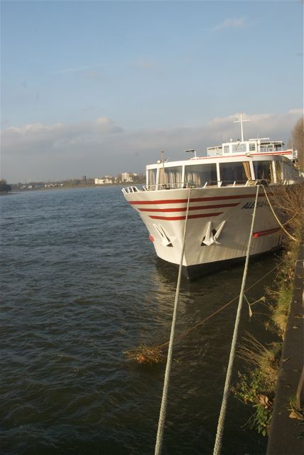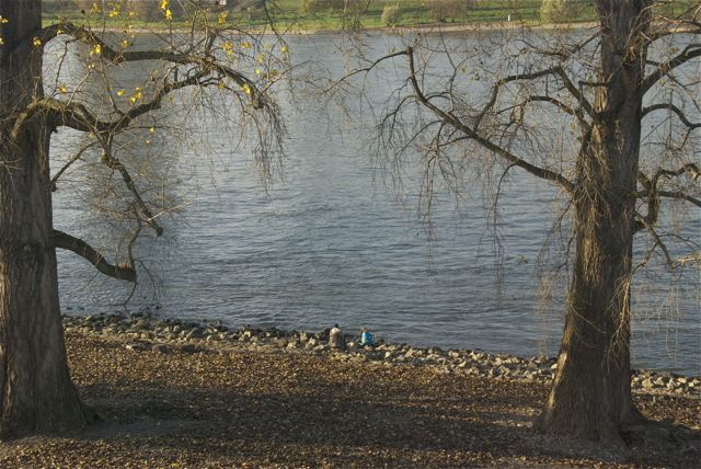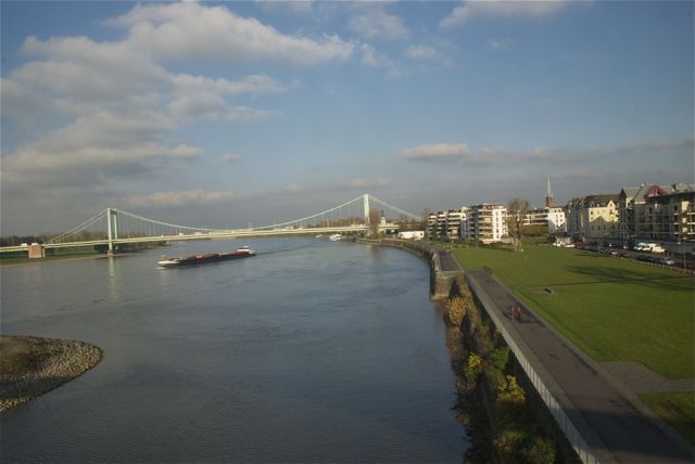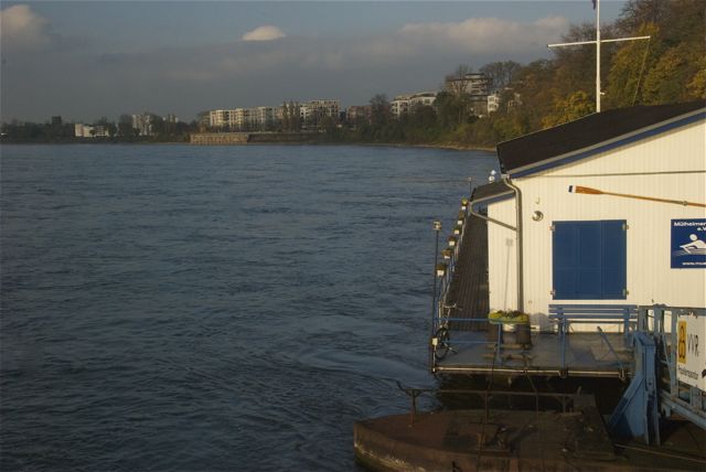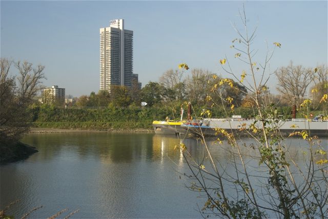 Gleich hinter der kleinen Nonne von vorgestern kann man denn schon mal durch ein Gebüsch einen Blick auf den Mülheimer Hafen und den Rhein werfen.