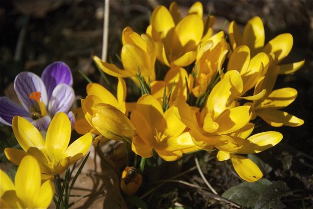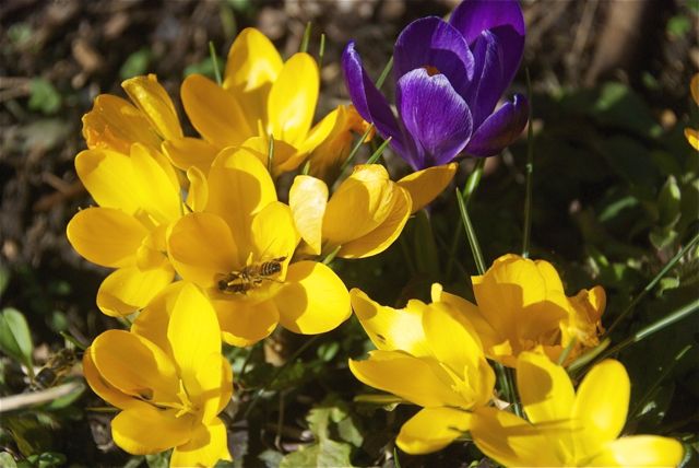 Außer mir noch Bienen an der Bar. Besonders beliebt wieder die gelben Krokusse. Offensichtlich gibt es noch nicht allzu viel zu futtern, denn bis zu drei Bienen kloppten sich in einer Krokusblüte. Aber: Geduld, die Damen. Bald gibt es Nachschub. Denn voriges Jahr habe ich ja gefühlt hunderte Zwiebeln eingegraben, von denen ich nicht so genau wusste was das ist. Zum teil Werbegeschenke, zum Teil von anderen weggeworfene Zwiebeln. Und die kommen jetzt erst. Unter anderem sind es bunte Krokusse. Bin gespannt, was da sonst noch so wächst.