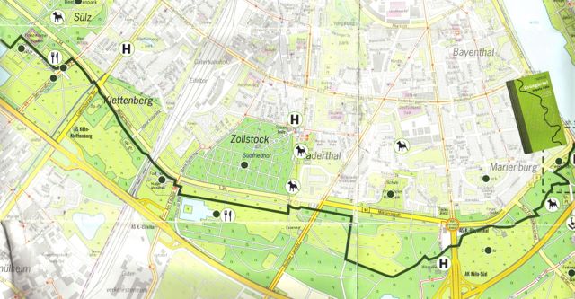 Fazit: Hat mir besser gefallen, als der rechtsrheinische Teil. Waldige wechseln ab mit parkartigen Abschnitten, es gibt verschiedene Sportanlagen und künstliche Gewässer. Es ist auch einfacher abzubrechen oder eine Pause einzulegen.