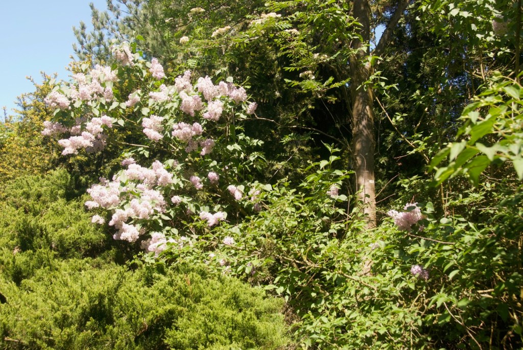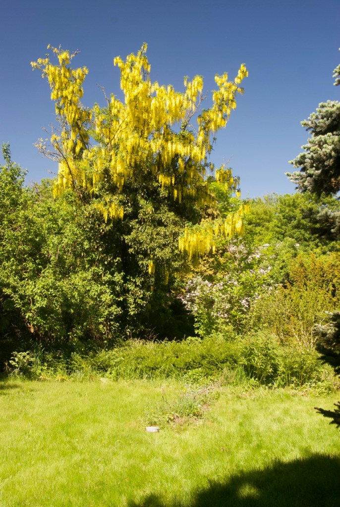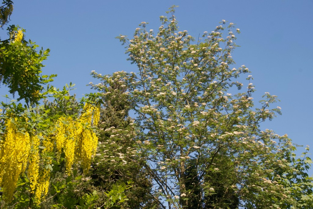 Dieses Jahr blühen alle Bäume wie verrückt. Die Fichten haben wochenlang alles gelb bestäubt, im Moment blüht Goldregen, Flieder und Eberesche. Eigentlich dachte ich, der Goldregen geht ein. Es ist aber wohl nur ein toter Ast, den der Specht gern behämmert.