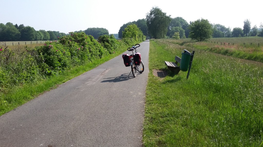 Nach einem letzten Blick aus dem Fenster und einer Runde durch den Park, ignoriere ich das Handy, das wieder die Straße den Berg hoch will, und fahre ein kleines Stück zurück über die Brücke zum Ruhrtal-Radweg. Dem folge ich ganz einfach bis Wickede. Ohne Stress, ohne Autos, in Ruhe und Gemütlichkeit, über einigermaßen idiotensicher ausgeschilderte Radwege und Nebenstraßen.