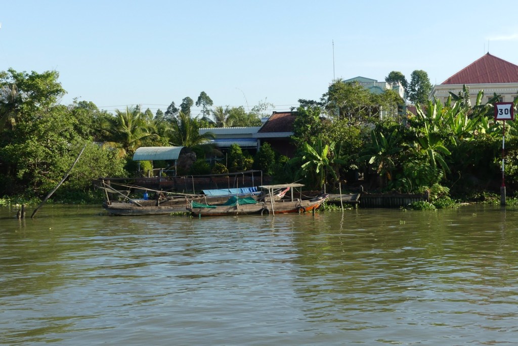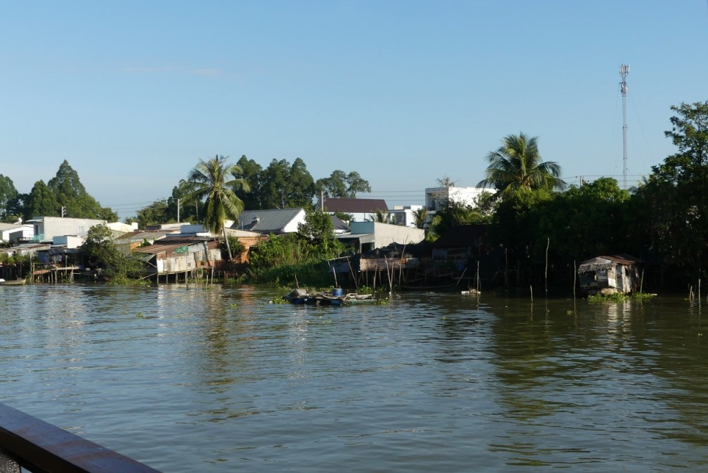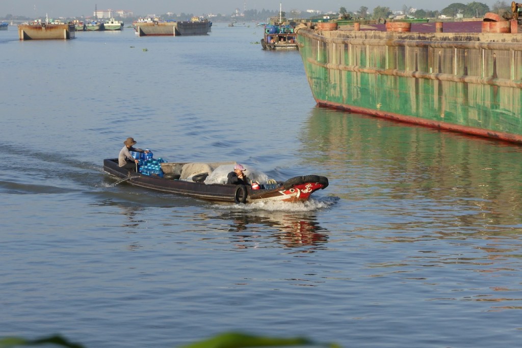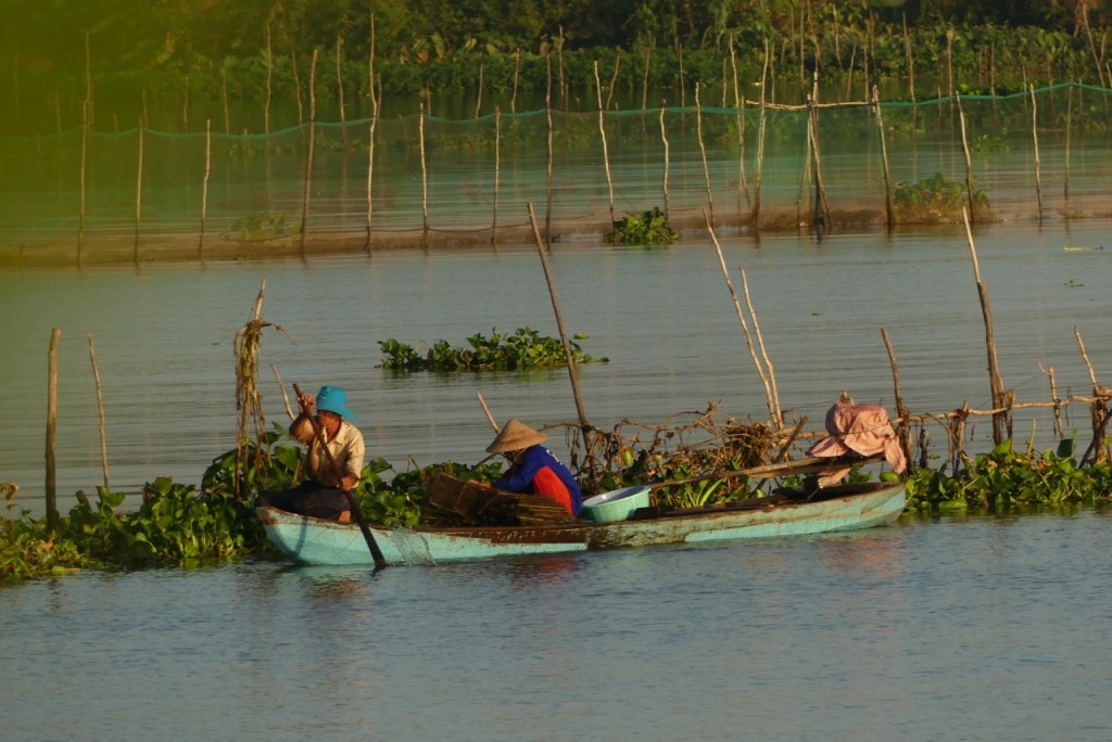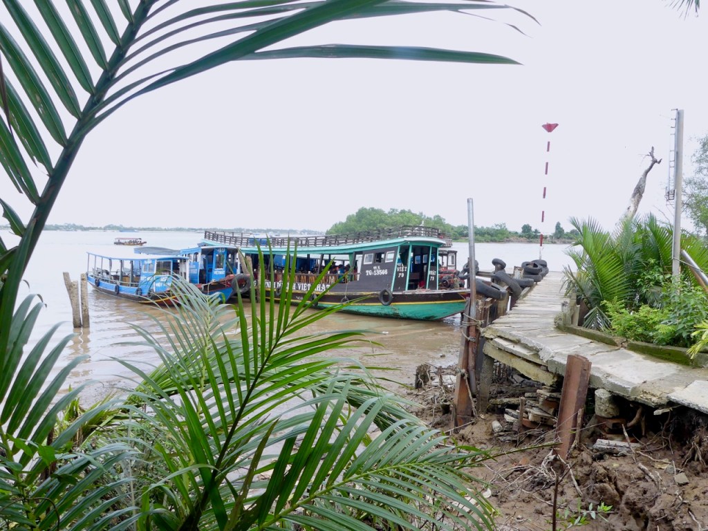 Nach der sehr schönen Radtour um Ben Tre und dem Besuch einer Cocos-Bonbon-Manufaktur, werden wir mit einem kleineren Boot zu einer Dachunke übergesetzt.