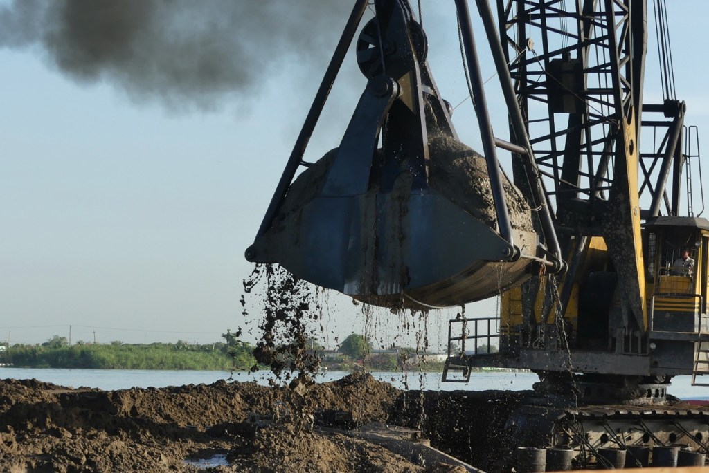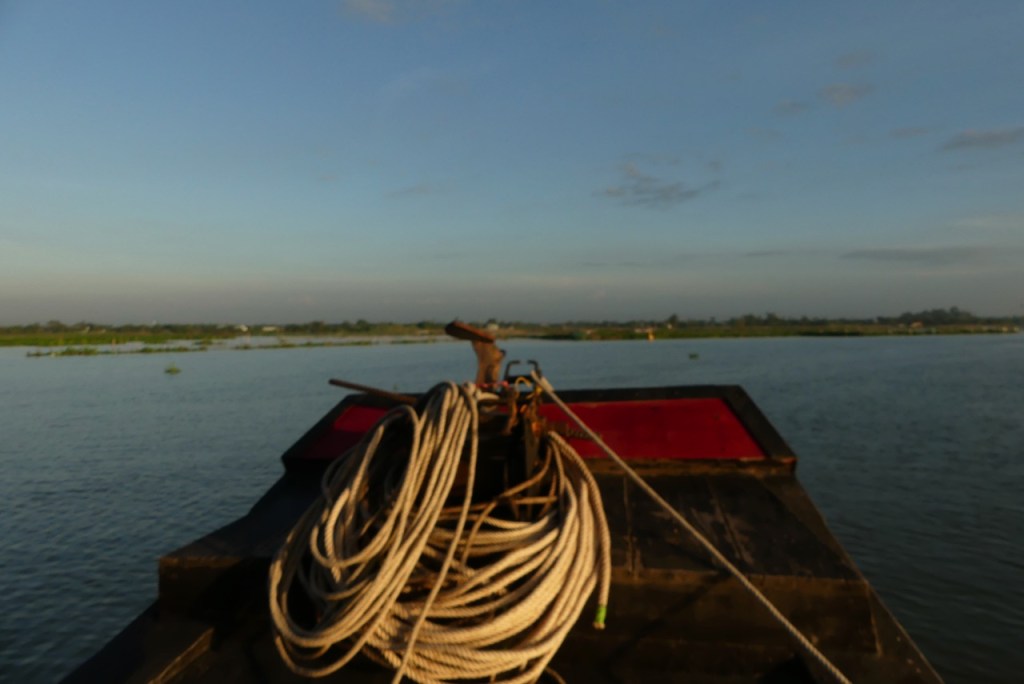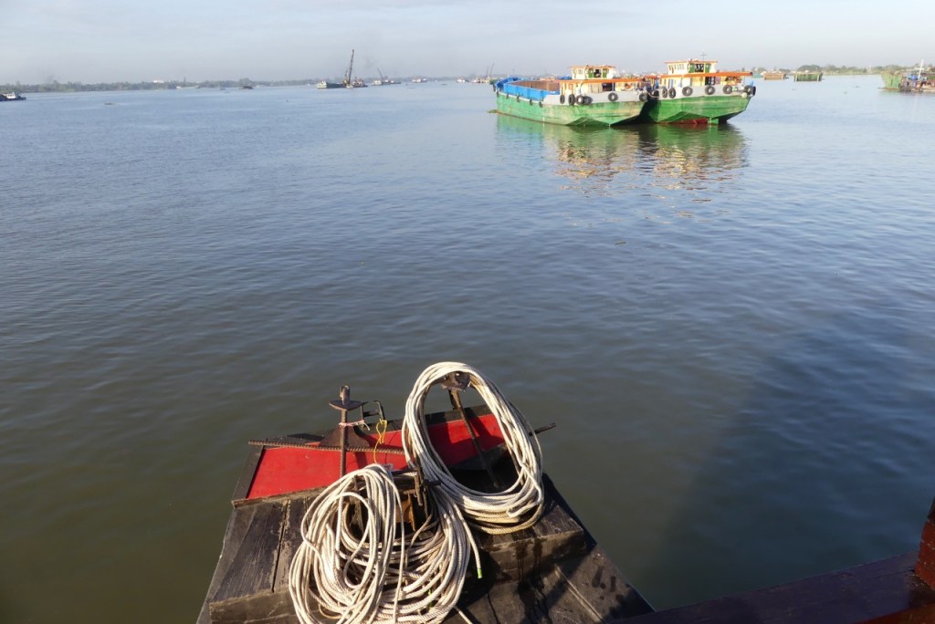 Am nächsten Morgen erwachen wir in idyllischer Umgebung von Schwimmbaggern umstellt. Der Flusssand wird hauptsächlich für Bauprojekte genutzt und um die Felder zu erhöhen. Die Bagger nehmen ihren Betrieb wieder auf, just in dem Moment als unsere