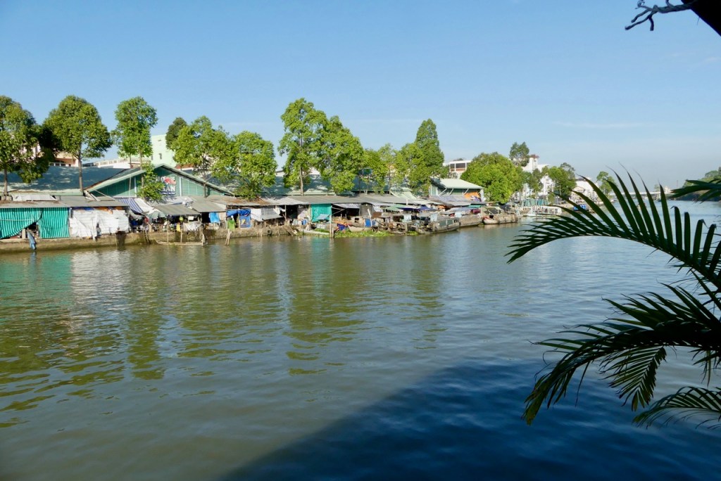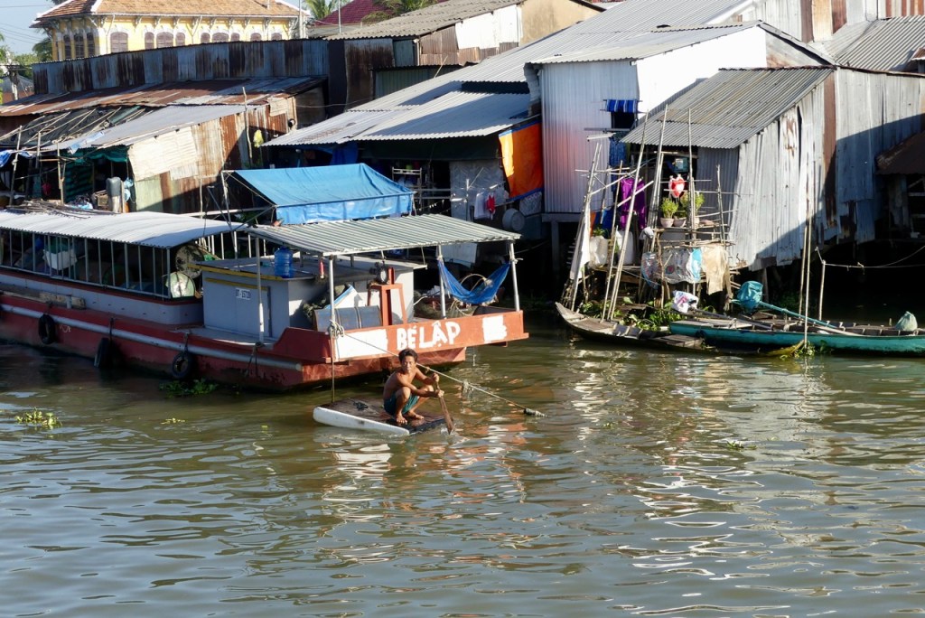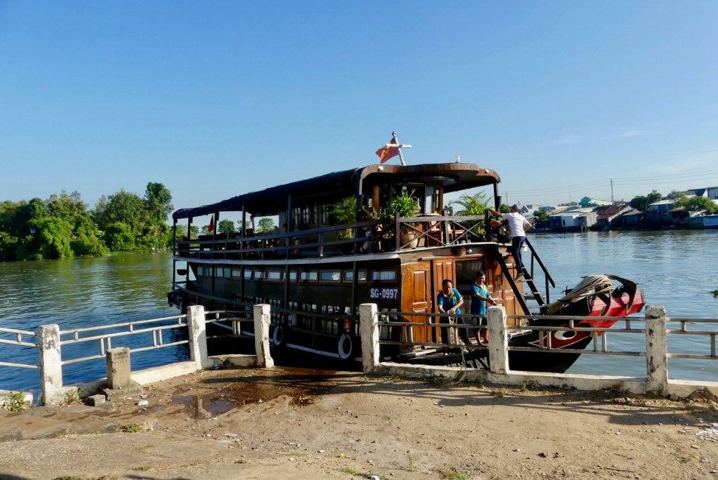 Während wir langsam über den Mekong gleiten, werden wir gemästet: Mittagessen, Nachmittags Cocktail mit Obst -Verkostung, Abendessen.