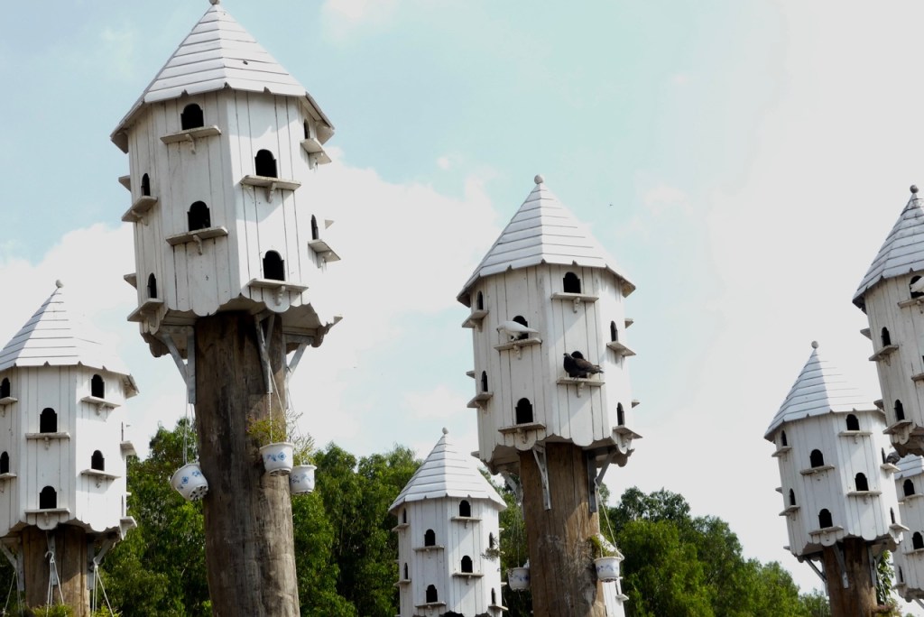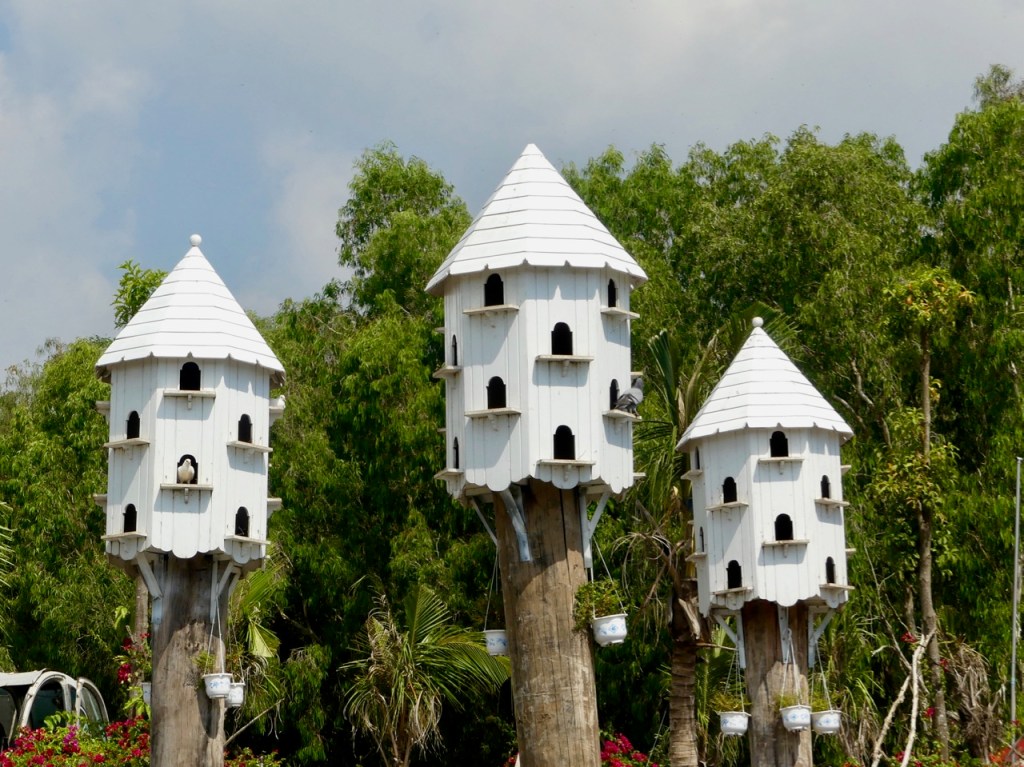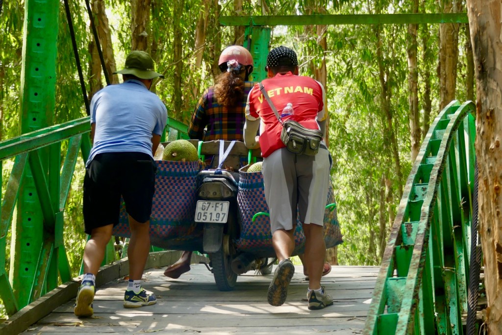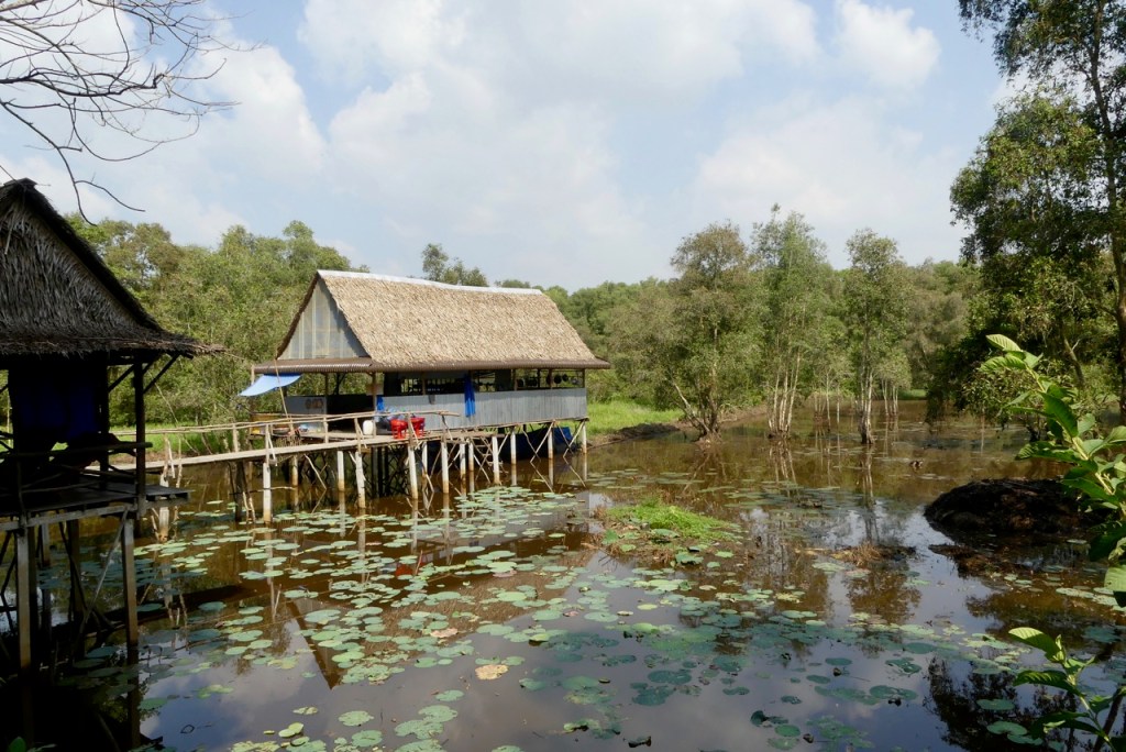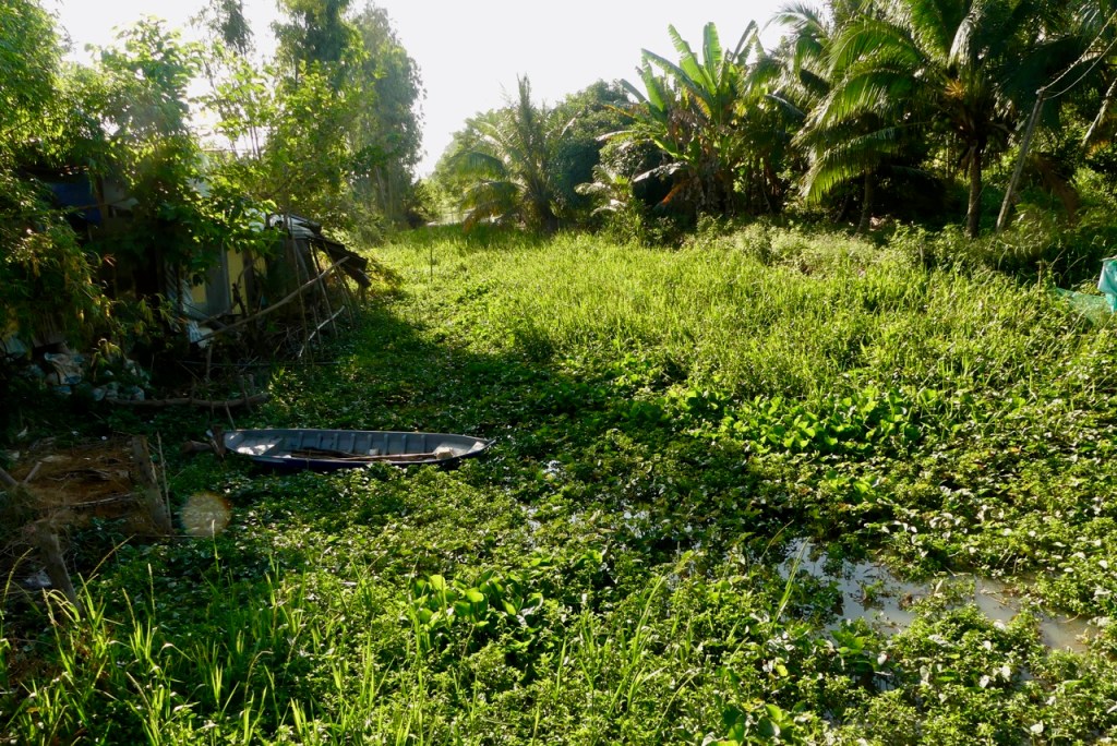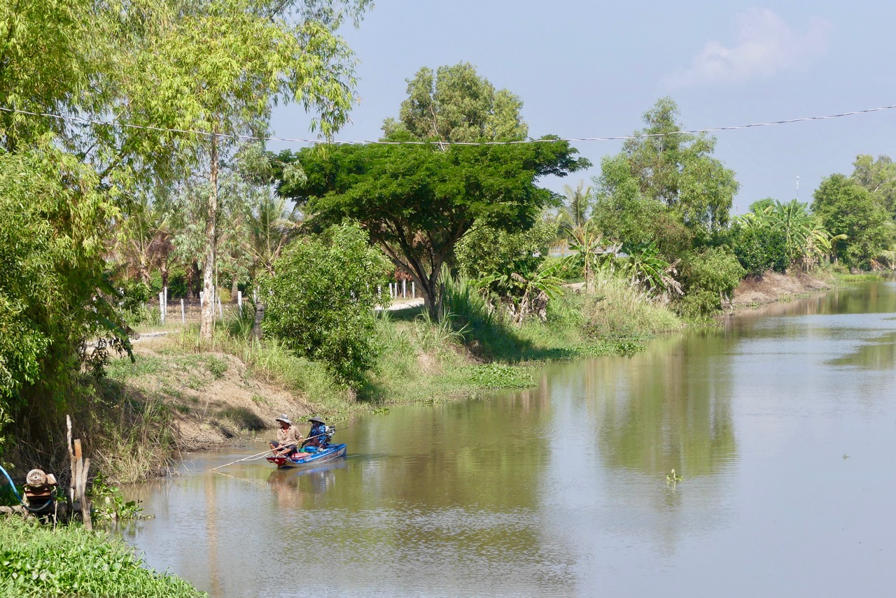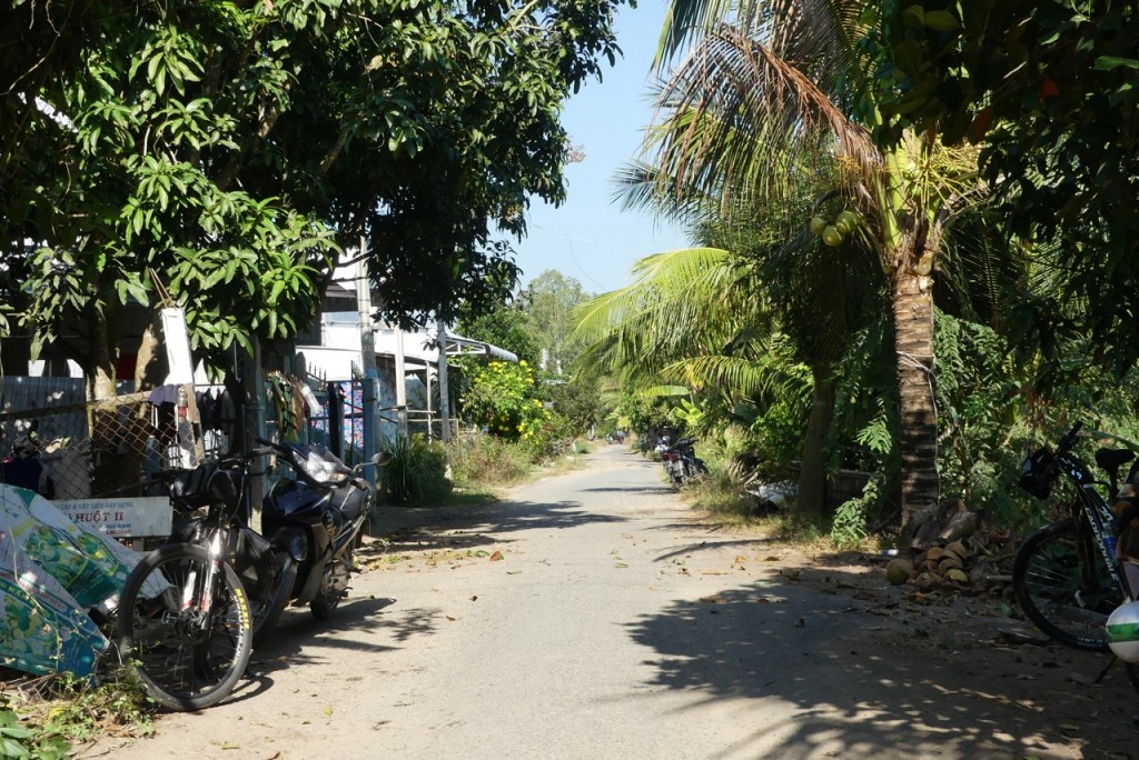 Wir befinden uns nun an der Grenze zu Kambodscha, und brechen auf zu einer neuen Radtour. Bisher sah es ziemlich überbevölkert aus. Das liegt aber daran, dass die Menschen möglichst nah an der Straße entlang bauen. Die Felder liegen hinter den Häusern. Heute radeln wir aber durch die Felder. Und wieder gibt es interessantes am Wegesrand zu entdecken