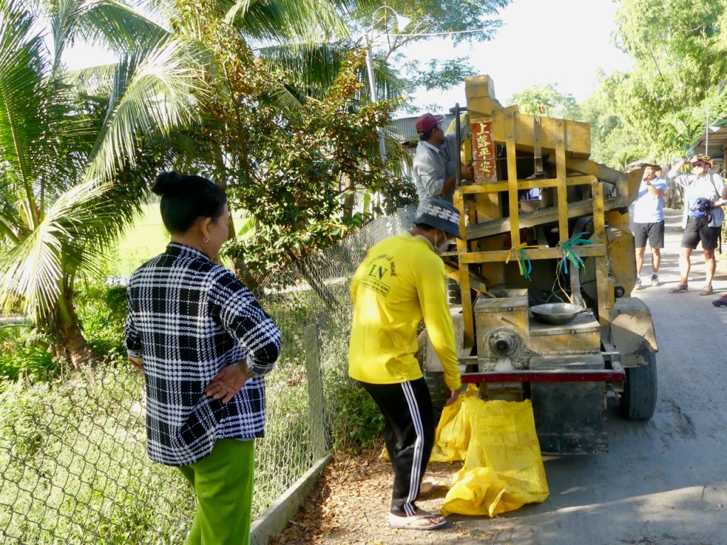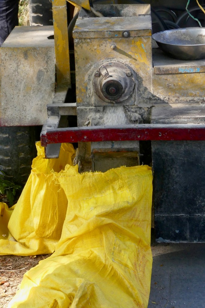 So wie diese Reisdreschmaschine. Oben wird der geerntete Reis eingefüllt, vorne kommt der geschälte Reis raus, an der Seite die Spelzen. Die können noch als Fischfutter verwendet werden, oder zum Mulchen.