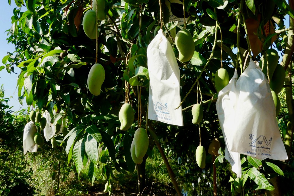 In weiße Säckchen verpackt hängen Mangos von den Bäumen. Die Tüte soll verhindern, dass sie sich auf einer Seite rot färben. Man isst sie nämlich auch gerne grün, mit Salz. Außerdem sind sie druckempfindlich. Die größeren Herren sollten besser die Köpfe einziehen.