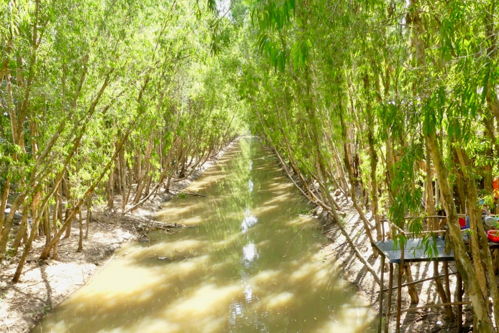 Schließlich ändert sich das Bild. Wir radeln durch eine Eukalyptus -Alle, die zum Schutzgebiet Tra Su führt.