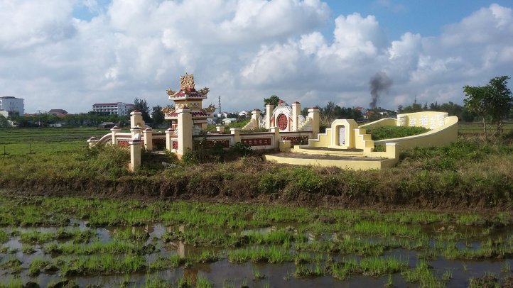 Zurück geht es durch ein Neubaugebiet an einem Fluss entlang, über eine Brücke, nochmal durch Reisfelder, an Kriegsgräbern vorbei.