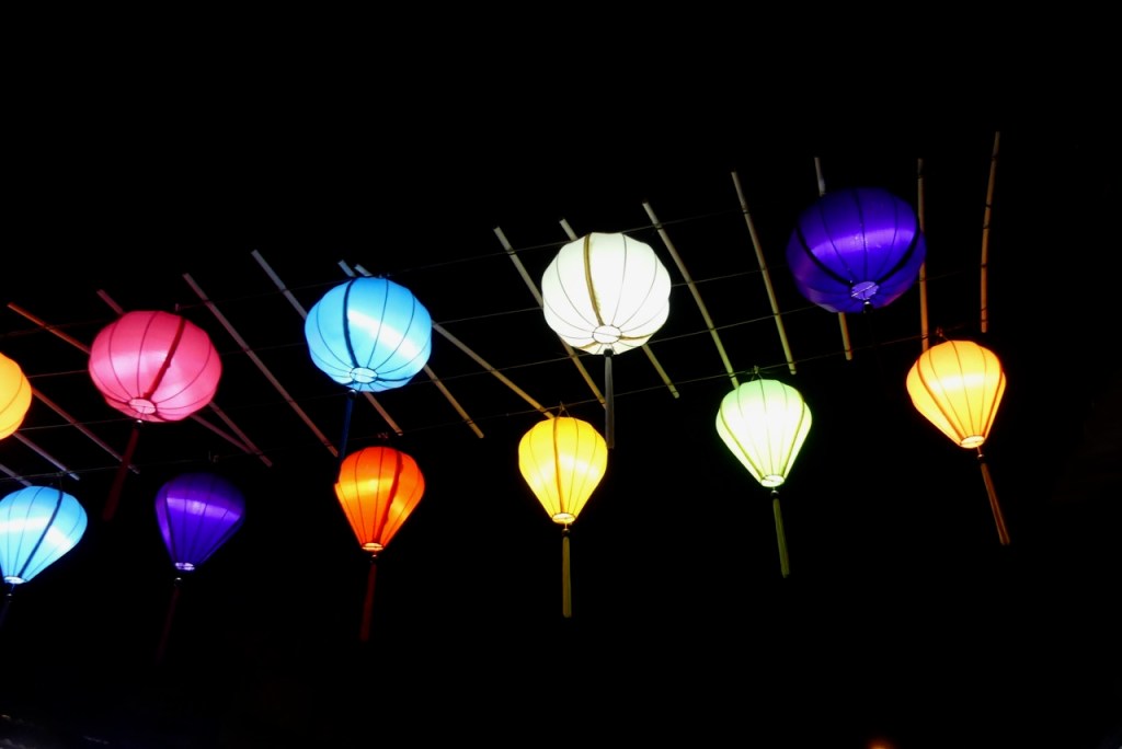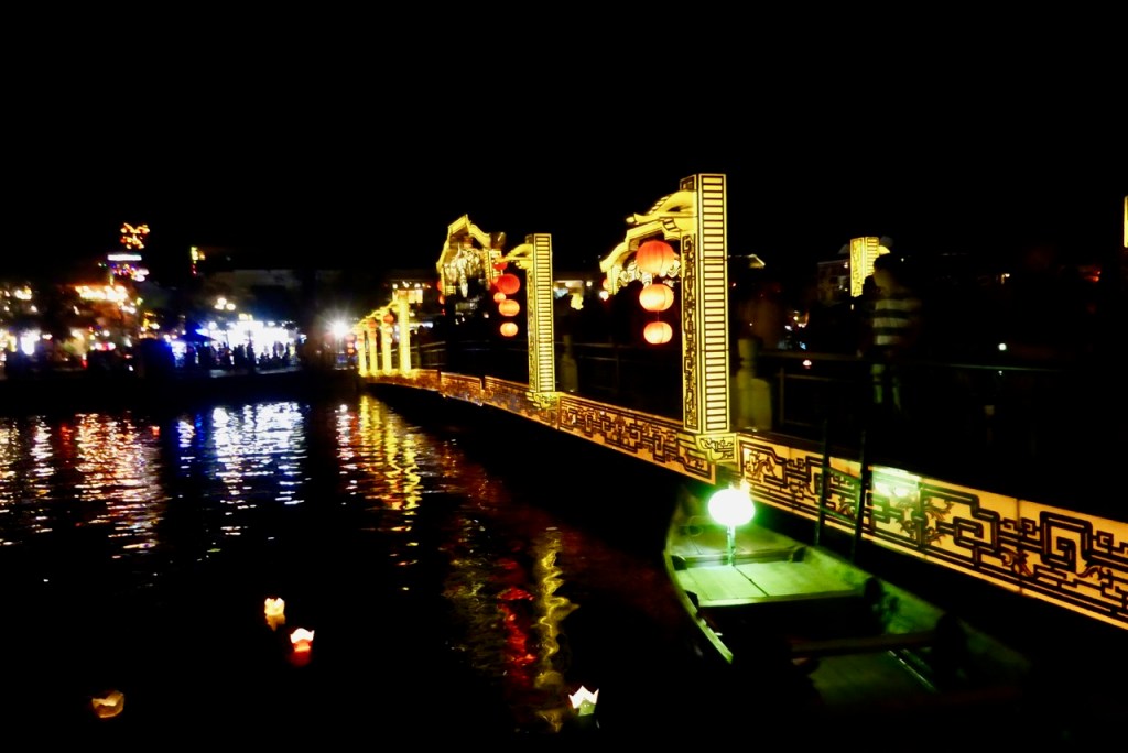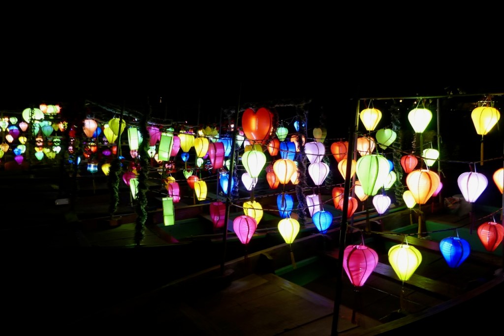 Auf dem Fluss schwimmen bunt beleuchtete Ausflugsboote und kleine Glück verheißende Kerzen.