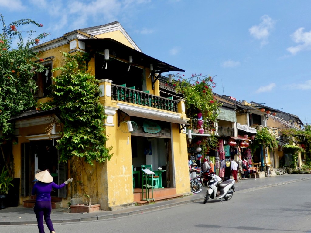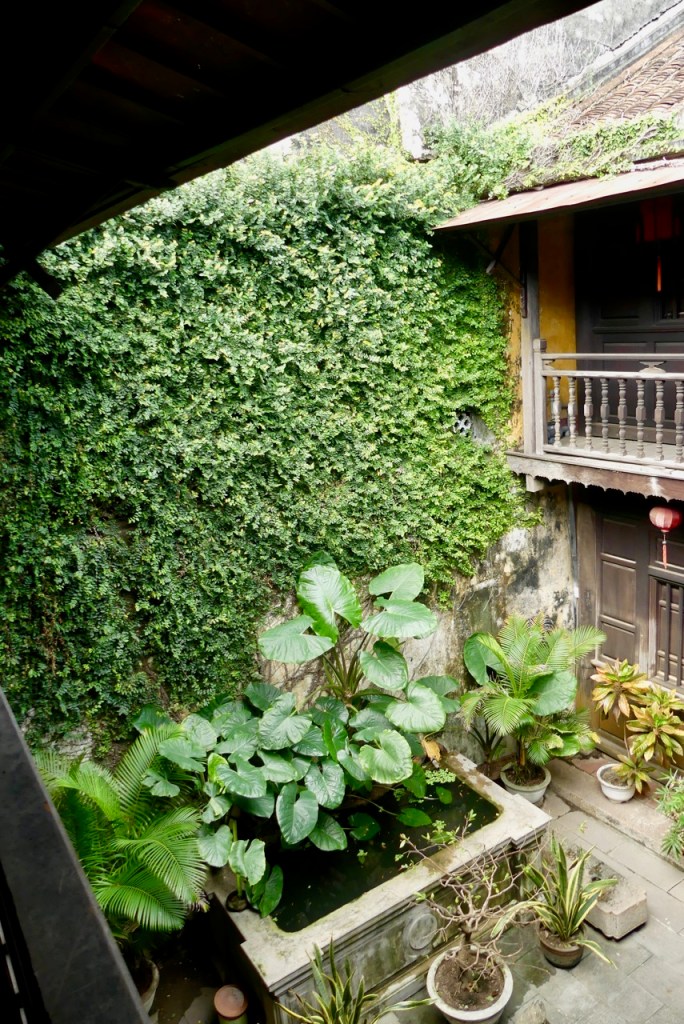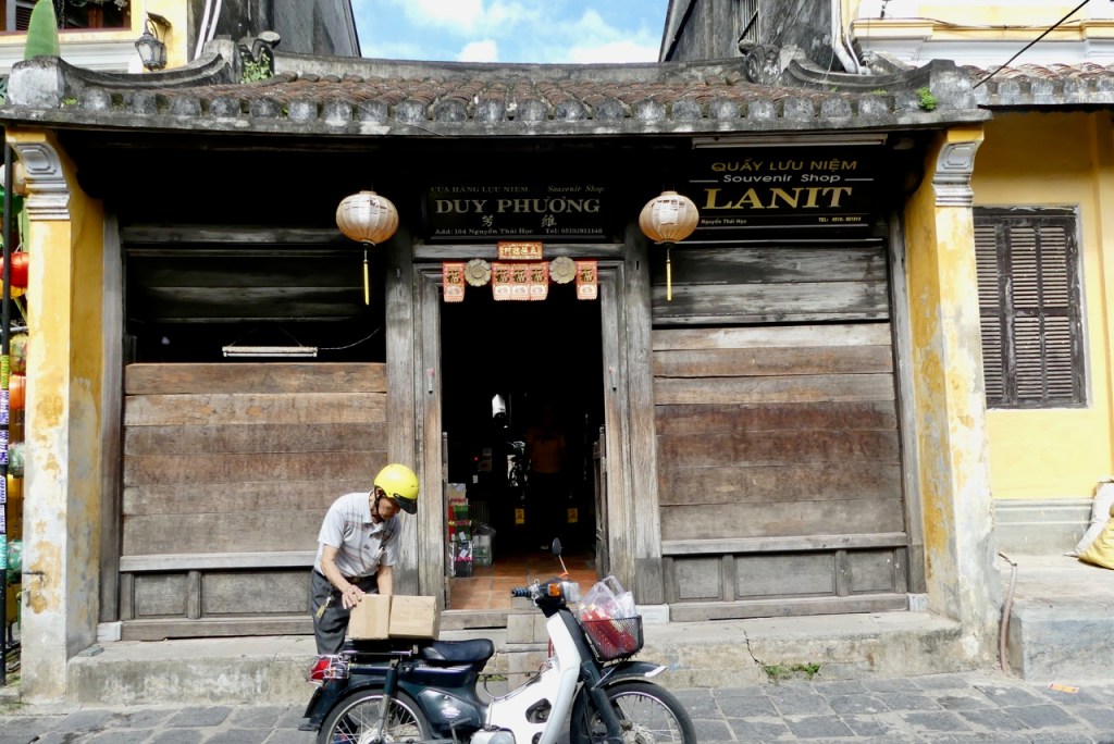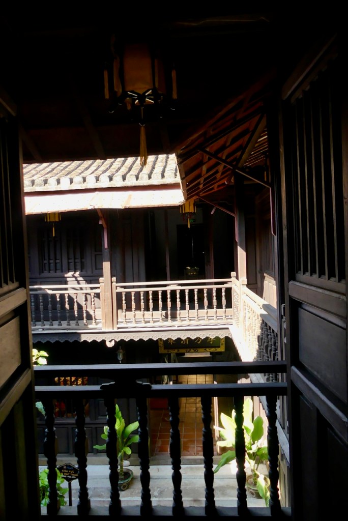 Alle Häuser in Hoi Ans Altstadt haben zwei Eingänge, zu zwei parallel verlaufenden Straßen und einen Innenhof. Man kann also in einem Haus zwei Geschäfte an zwei Straßen haben. Clever gemacht! Die beiden Eingänge leicht liegen schräg versetzt gegenüber, damit die gute Energie im Haus bleibt und der Fußboden ist zur Mitte hin abgesenkt.