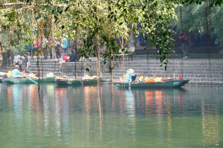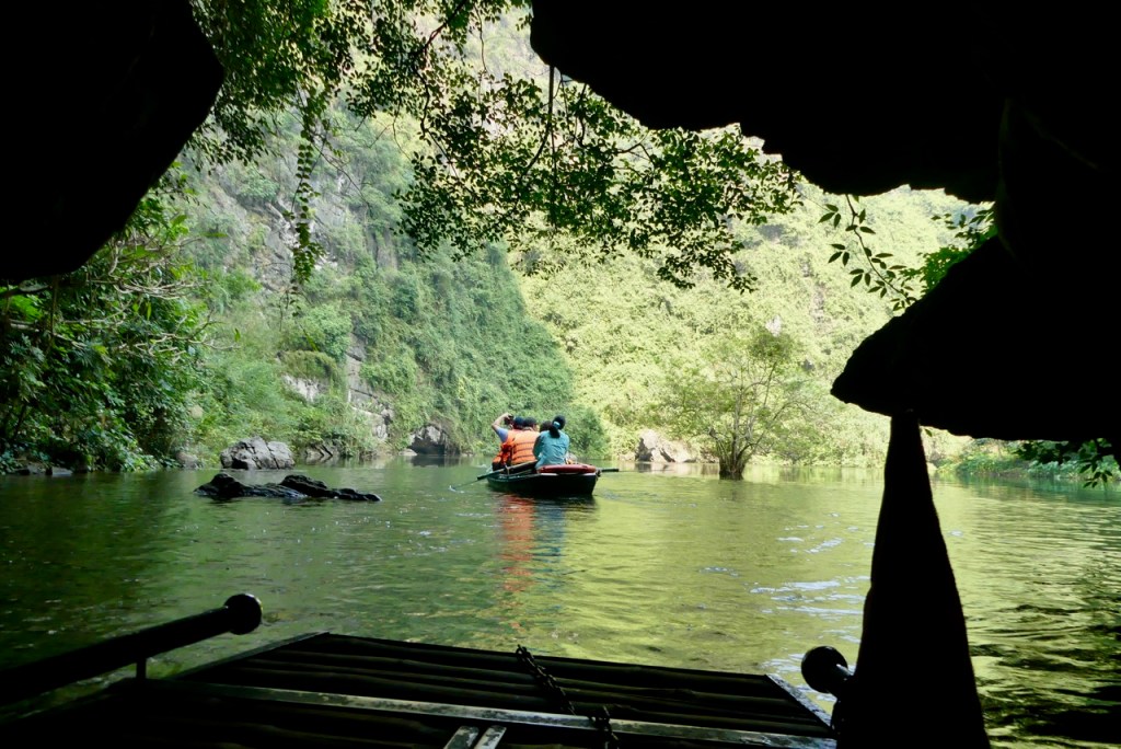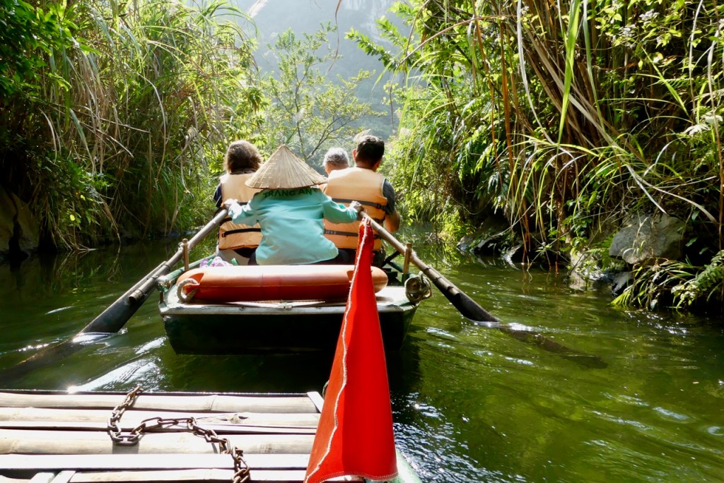 Wir lassen uns von kleinen Frauen durch die Kalkberge und Höhlen der trockenen Ha Long Bucht rudern.