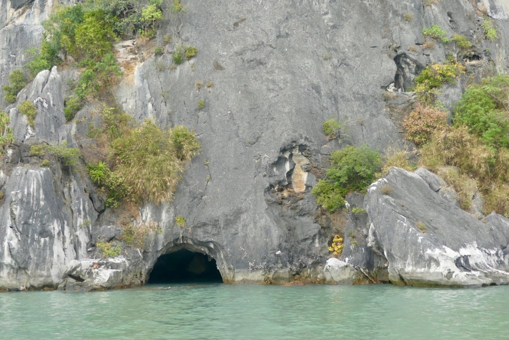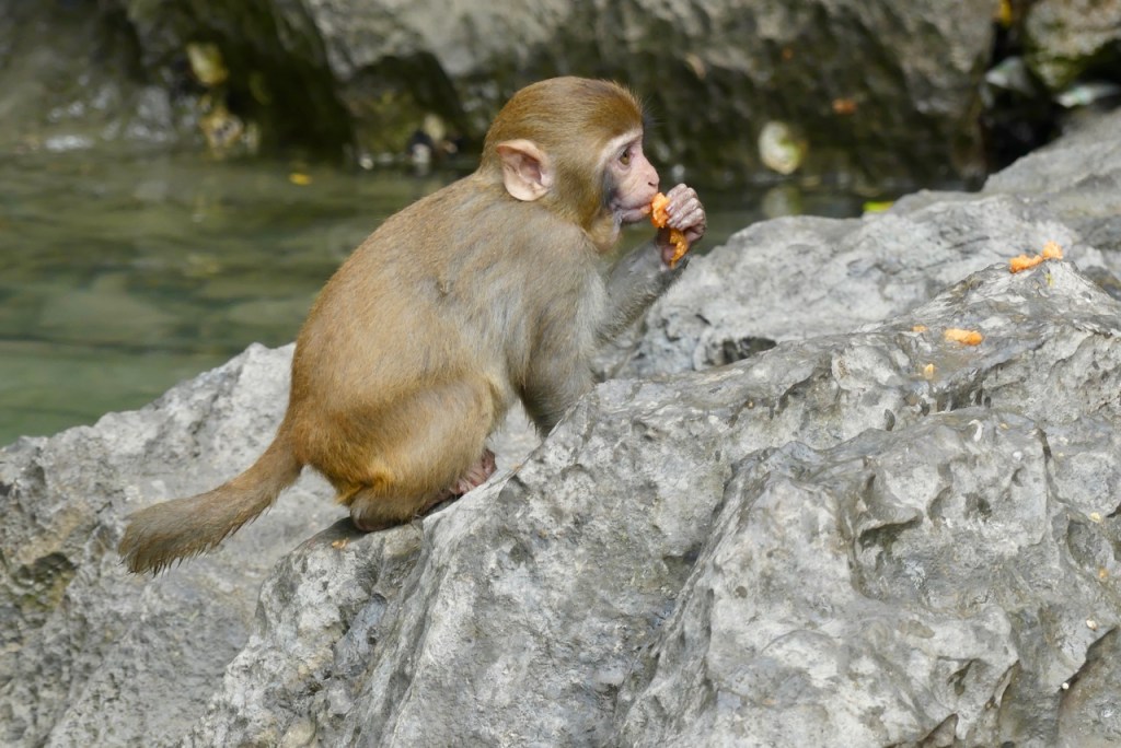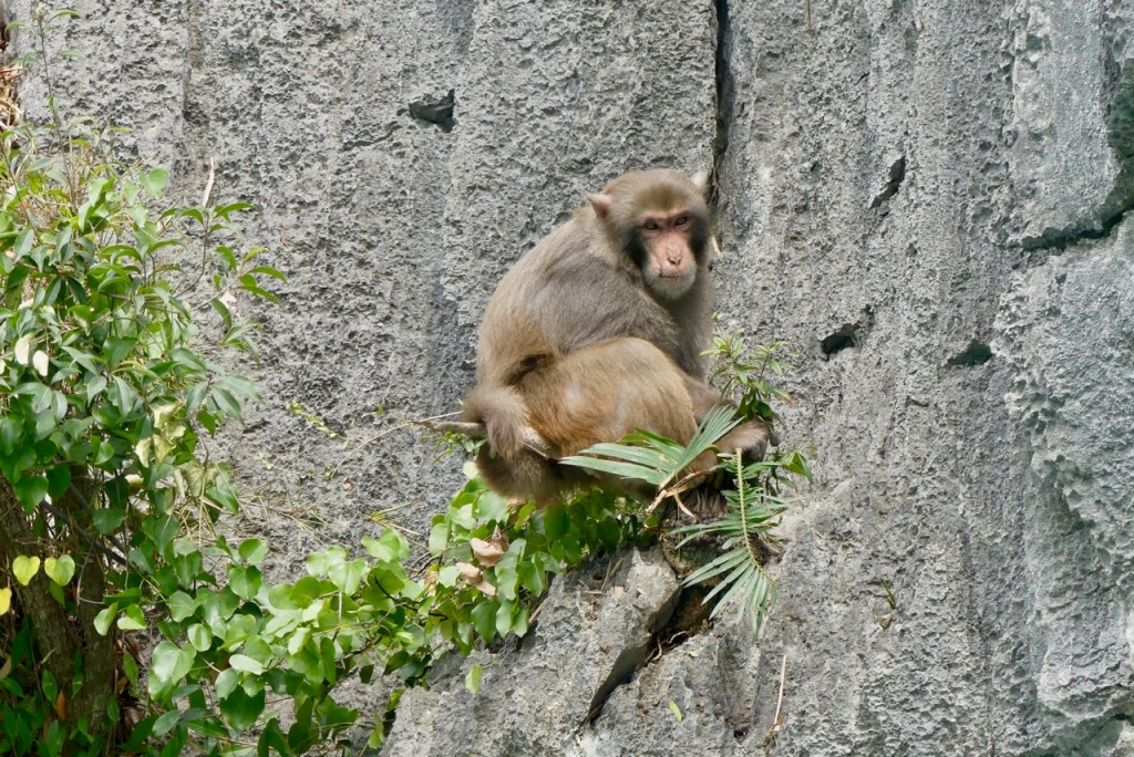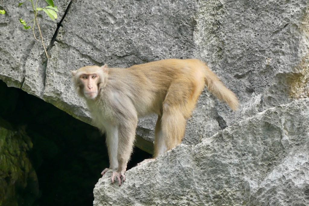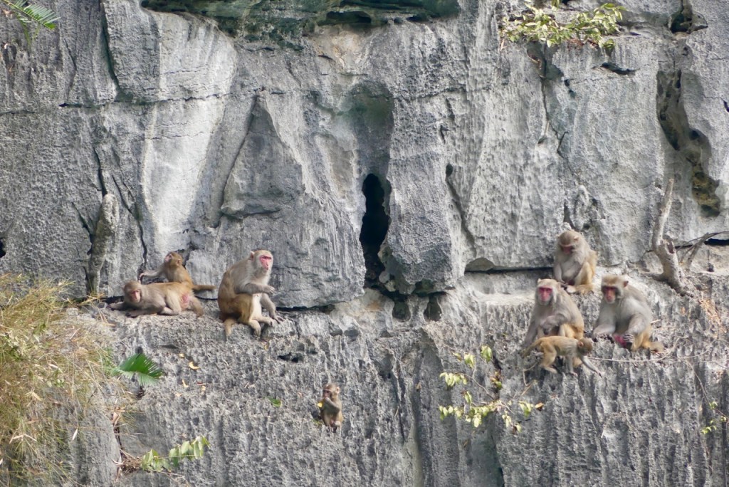 Durch eine enge Karsthöhle werden wir gerudert und besuchen eine Affenfamilie. Die Makaken klettern geschickt, teilweise kopfüber an den steilen Felsen.