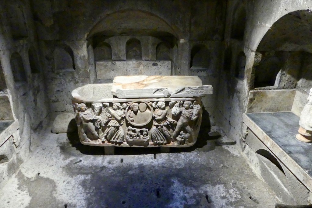 In den Nischen standen früher die Urnen der Verstorbenen. Die Grabkammer ist einem römischen Speisesaal nachempfunden, mit Speiseliegen für die Herren und Korbsesseln für die Damen, aber alles in Stein gehauen.