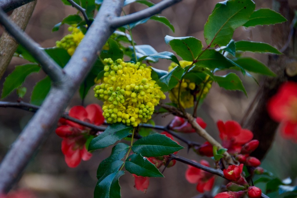 Eine Mahonie ist das gelbe. Strunzhäßlich, aber die Bienen lieben sie… *g*