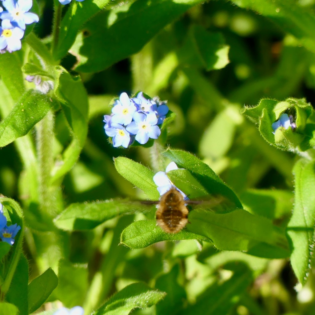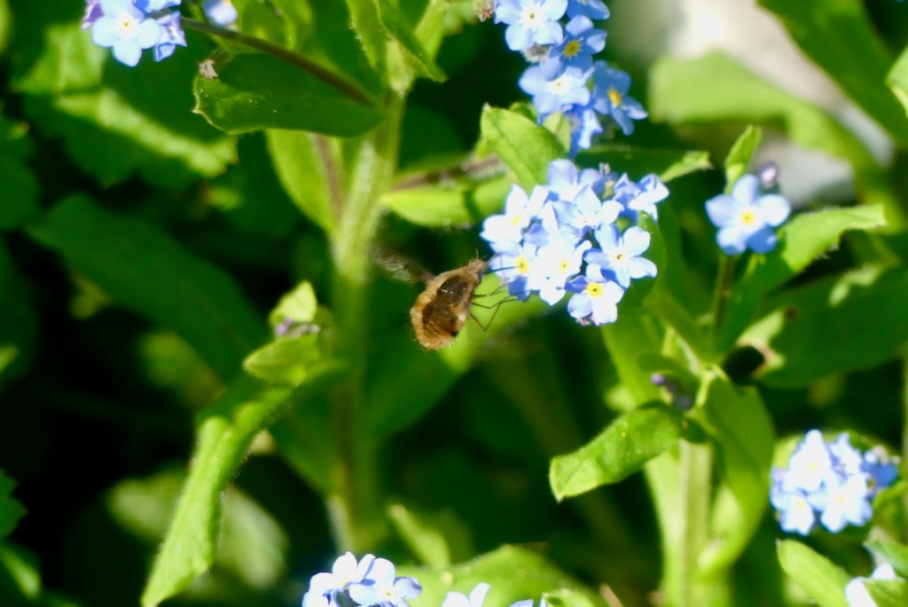 Ist ein Hummelschweber, auch Wollschweber genannt. Als Larve parasitiert er in Wildbienennestern. Als Imago saugt er an Blüten von hier Vergissmeinnicht, besonders beliebt ist Gundermann. Die Rüsselspitze ist übrigens zweigeteilt. Das hat mir so ein Schweber gezeigt, der auf meinem Fuß nach Mineralstoffen suchte. Da hatte ich aber keine Kamera mit.