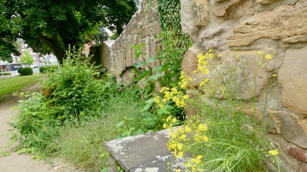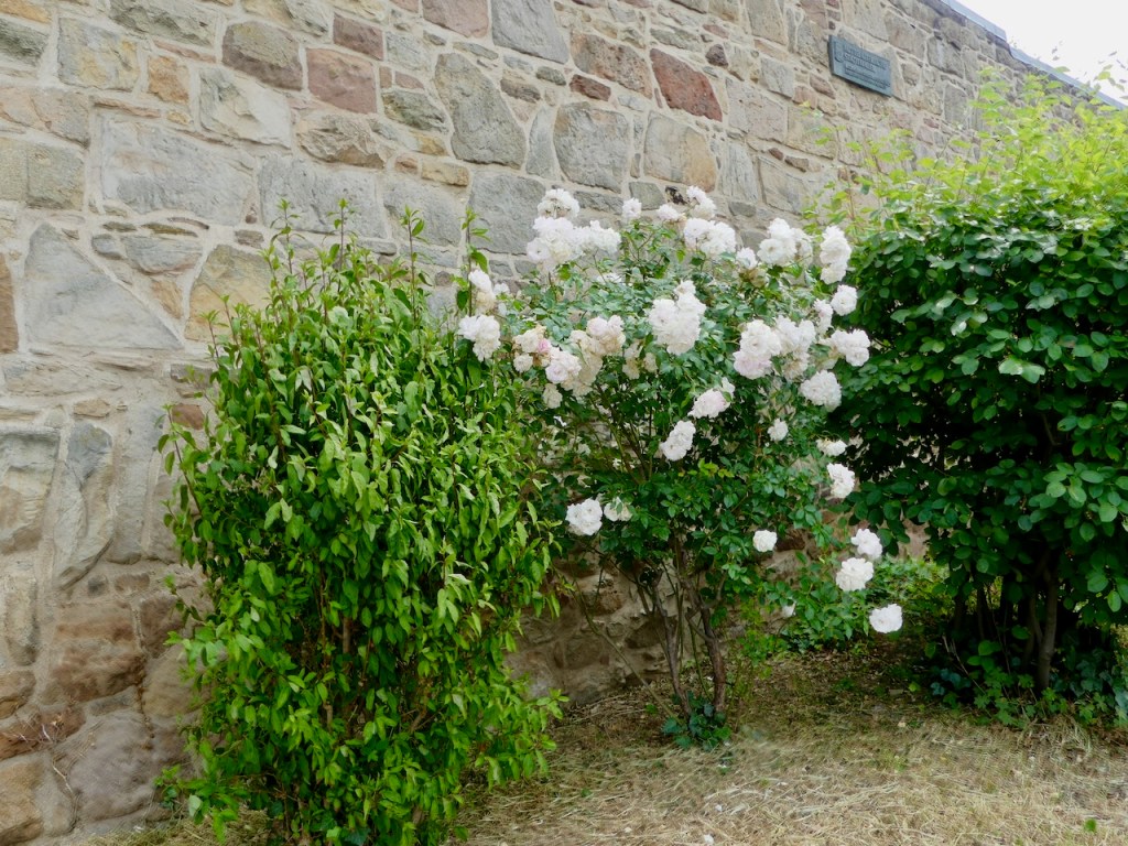 Die Evangelische Gemeinde hat ihre Gebäude hübsch zuwuchern lassen und an dem Stadtmauerrest blüht ein Rosenbusch. Und dann: