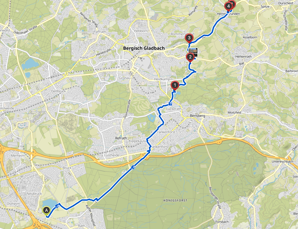 Pünktlich an der Strundequelle war der Handy-Akku leer. Zurück ging es also auf einigermaßen bekannten Wegen über Bergisch-Gladbach.