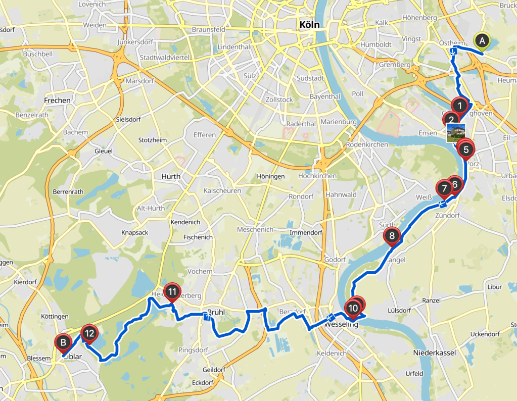 Überraschung! Ich hätte geschworen, ich müsste ganz Köln durchqueren, um auf die Wasserburgen-Route zu treffen. Aber der allwissende Routenplaner meinte, der kürzeste Einstieg wäre über Wesseling und Brühl. Soll mir recht sein, die Strecke kenne ich nicht. Also erst einmal an den Rhein.