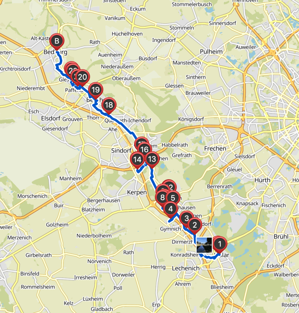 Und weiter geht es, immer an der Erft entlang, vorbei an Horrem und Quadrath-Ichendorf. Und so langsam kommt der kleine Hunger, dann der große.