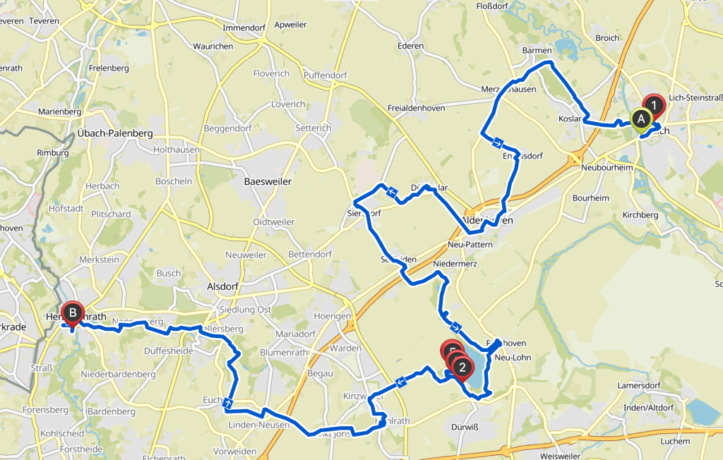 Schließlich erreiche ich Herzogenrath. In meiner vorgebuchten Unterkunft weiß man von nichts. Ich habe aber die Buchungsbestätigung in den Emails. Lang lebe das Schmachtfon! Zimmer gibt es aber sowieso noch genug. Nur der Rezeptionist war kurz vor Feierabend. Als ich das Rad zum Schuppen bringe, gießt es.