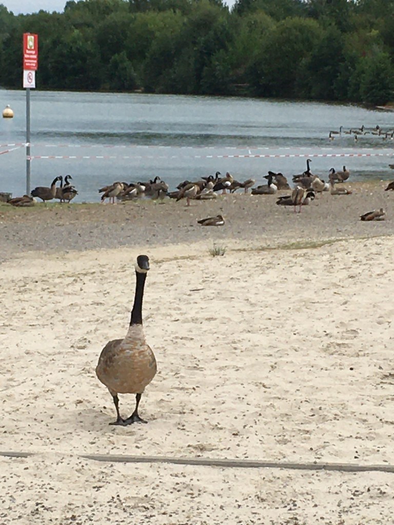 Am beliebten Badestrand des Blausteinsee vertilge ich eine gigantische Pizza. Muss ich erwähnen, dass das Naherholungsgebiet ein Tagebau war?