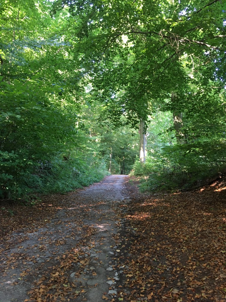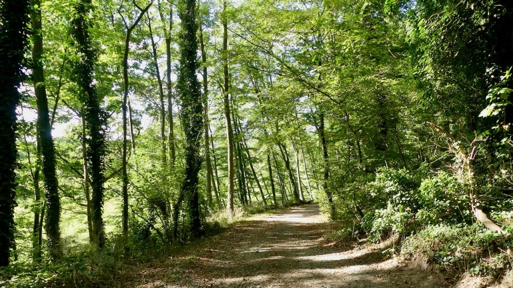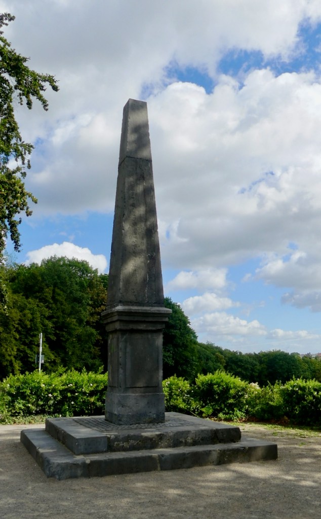 Nach dem letzten schotterig-steilen Anstieg, treffe ich auf den Obelisk „Zum blauen Stein“. Er wurde 1810 zur Vermessung des Rheinlands aufgestellt und soll an die Besuche Pauline Fürstin Borghese, der Schwester Napoleon Bonapartes, erinnern, die im angrenzenden Wald oft spazieren ging – so also auch der Name Paulinenwäldchen.