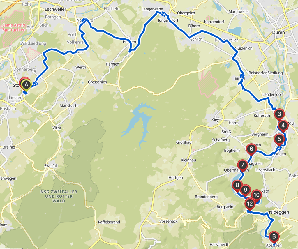 Über das Filmset und dann schon die erste lange Steigung hoch. Nachdem ich die letzten drei Tage geschwächelt habe – lag es an mir, am Rad, am Weg? – ist der Plan erst mal zur Rur und dann entscheiden Düren und abbrechen oder weiter über Heimbach.