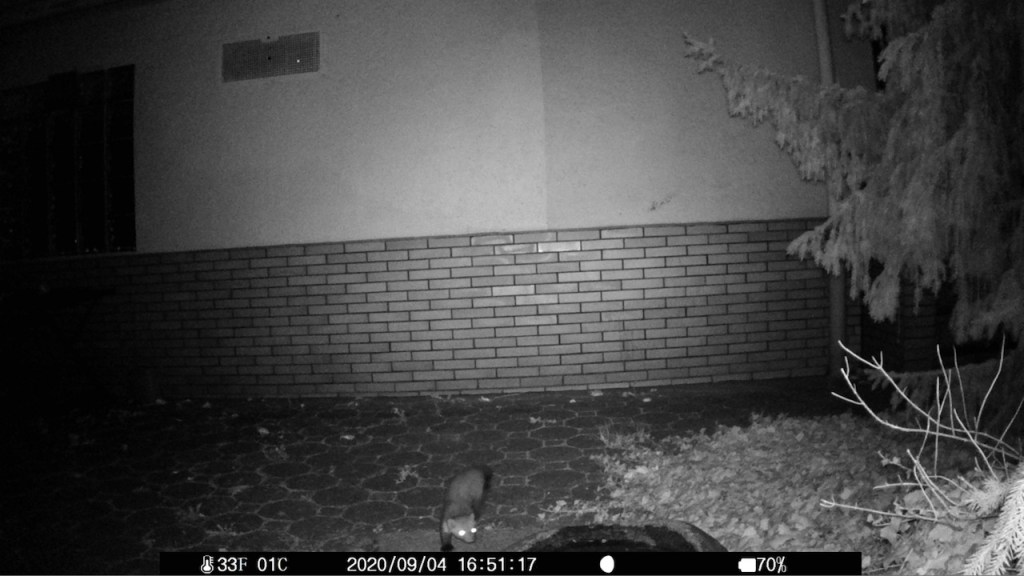 Als die Mieterin ein paar Tage weg war, hängte ich die Wildcam mal wieder hin. Zuerst am Wasserstein, leider zu hoch.