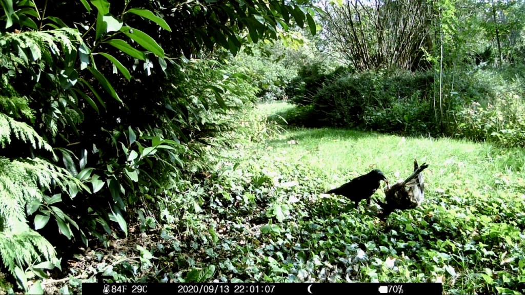 Und dann lag wieder eine tote Ringeltaube da, diesmal aber äußerlich unversehrt. Ich nutzte die Gelegenheit, lagerte sie nur etwas um und hängte die Kamera auf. Ab und zu habe ich auch mal geguckt. Zuerst waren nur ein paar Federn weggerupft, dann kamen Fliegen und Wespen, dann Fliegenmaden. Alle nicht im Bild.