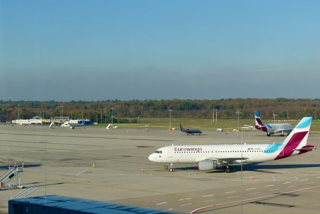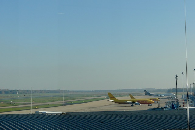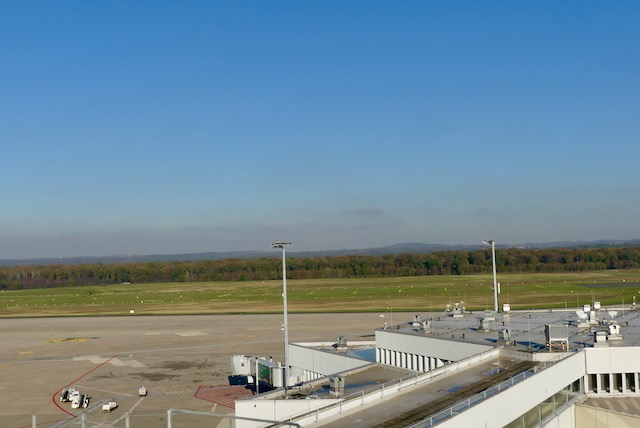 Auf der Besucherterrasse ist es sehr ruhig. Kein Düsenlärm, ein paar Flugzeuge stehen dumm rum, der Blick schweift über die Heide ins Bergische.