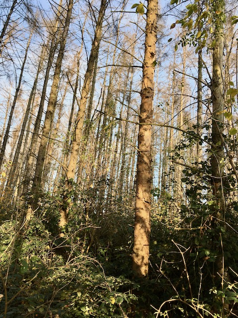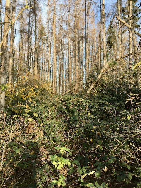 Unter den Toten fichten hat sich ein Dickicht aus Brombeeren und Holunder gebildet.