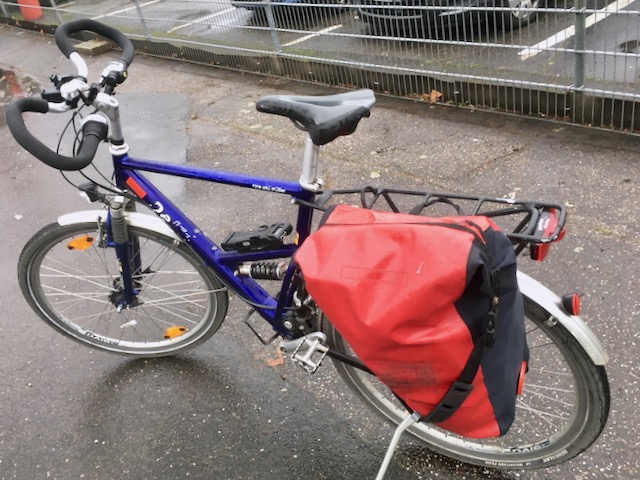 Morgens: Im REWE muss man jetzt einen Einkaufswagen durch die Gänge schieben, sonst kommt man nicht rein. Fataler Fehler! Wenn ich so ein Körbchen voll mache passt der Inhalt genau in die Fahrradtasche. Jetzt ist die komplett überladen und ich muss zurück schieben.